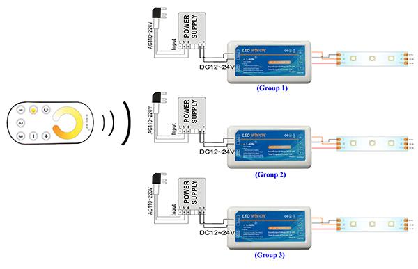 Remark:a remote control can operate 3 groups of controllers at the same time. each group of controllers can be composed of many controllers, such as 30 controller divided the 3 groups, then, each group control can remote 10 controllers, to achieve synchronously adjustable brightness effect.