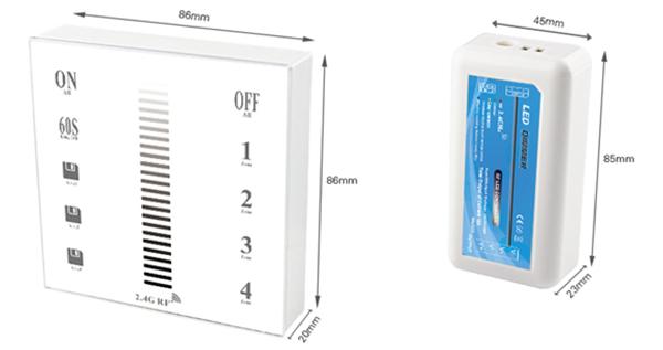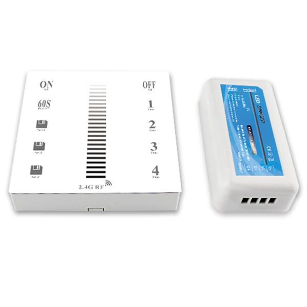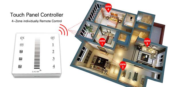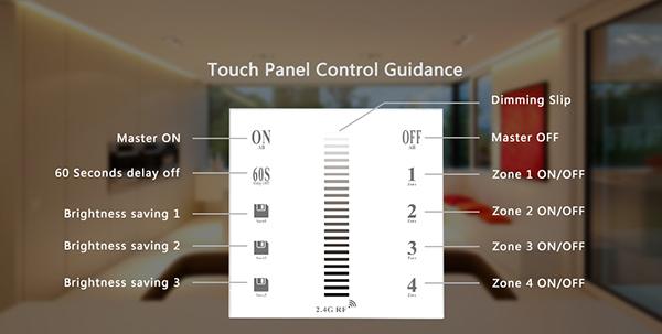 This is a 2.4G RF 4-Zone Wall-Mounted Touch Remote led dimmer, common remote for single color led controller. Adopt the most advanced PWM Control Technology, all kinds of the single color led lights can be controlled . Such as LED module, led strip, led control box, led source, etc. The installation is easy and simple. It has indicator light to feedback every touching on the remote, memory chip inside to save the previous statues no matter you turn off the light or cut off the power. User can Dimming, save the brightness as you want, turn on/off . 2.4Ghz RF Control technology can make the remote control more stable and anti-jamming, 30 meters transmission distance.