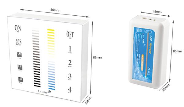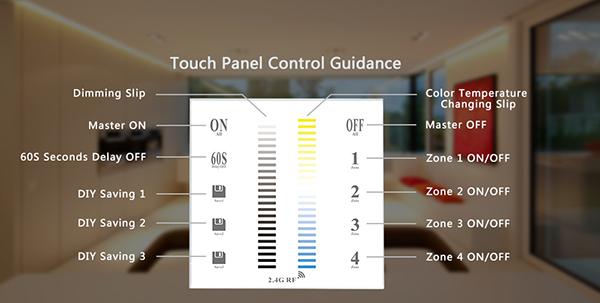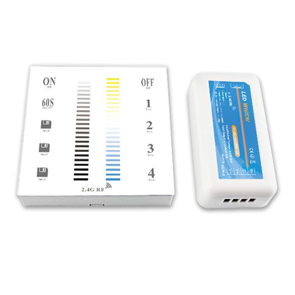 This is a 2.4G RF 4-Zone Wall-Mounted Touch Remote color temperature led controller. Adopt the most advanced PWM Control Technology, all kinds of the color temperature led lights can be controlled . Such as LED module, led strip, led control box, led source, etc. The installation is easy and simple. It has indicator light to feedback every touching on the remote, memory chip inside to save the previous statues no matter you turn off the light or cut off the power. User can choose different color temperature, adjust brightness, turn on/off . Saving the brightness and color temperature as you want. 2.4Ghz RF Control technology can make the remote control more stable and anti-jamming, 30 meters transmission distance.