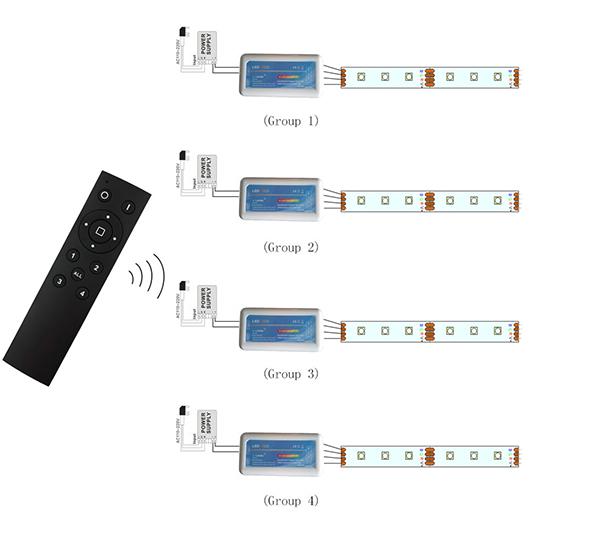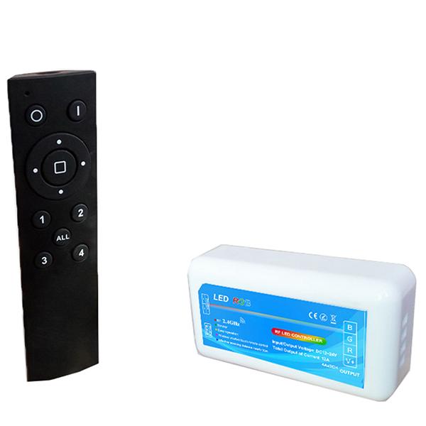 This 4 zone 2.4G RF remote RGB led controller adopt the most advance PWM control technology, can control all kinds of 3 channel (common anode) LED lights. Such as LED module, led strip, led control box, led source, etc. This controller is with indicating light and power off memory function, next time to used it, will start with the model it save. Easy connection and simple to used is the representative advantages of this controller. User can choose different changing mode, adjust the speed and brightness, turn on/off by the remote control according to their preference .
