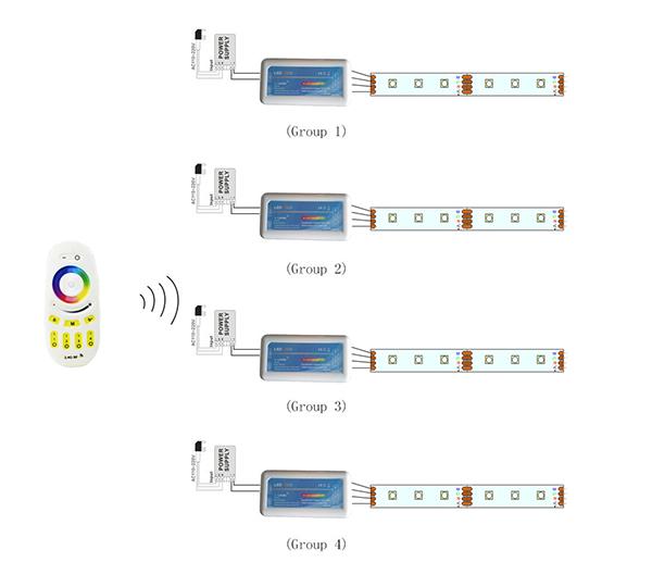This 4 zone 2.4G RF RGB Controller is the touch button RF wireless remote controller, the most advanced PWM (pulse width modulation) control technology have been adopted. It can be installed & used easily, plenty modes can be selected, speed & brightness can be adjusted with the remote. It also has memory function because we inside the memory chip on the PCB. With all these high functions, we still make it so tiny, and make it more economical and practical. It’s mainly used to control all kinds of constant voltage led lights, such as: LED source, LED strips, led wall washer, wall Glass curtain lights, etc.