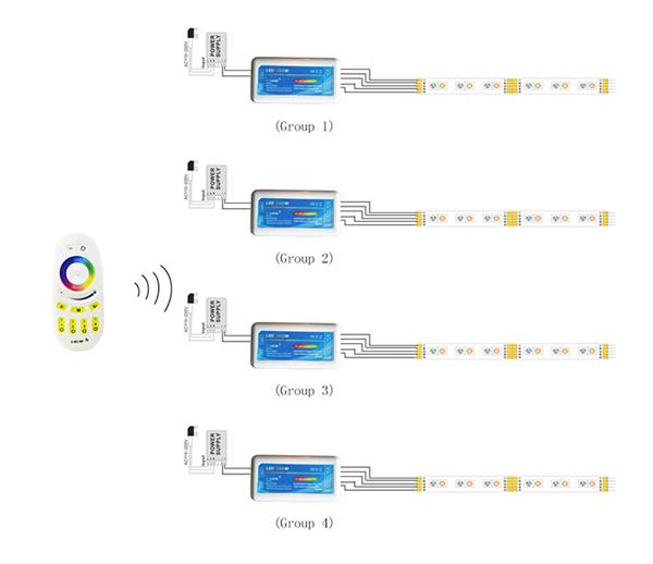 This 4 zone 2.4G RF RGBW Controller is the touch button RF wireless remote controller, the most advanced PWM (pulse width modulation) control technology have been adopted. It can be installed & used easily, plenty modes can be selected, speed & brightness can be adjusted with the remote. It also has memory function because we inside the memory chip on the PCB. With all these high functions, we still make it so tiny, and make it more economical and practical. It’s mainly used to control all kinds of constant voltage led lights, such as: LED source, LED strips, led wall washer, wall Glass curtain lights, etc.