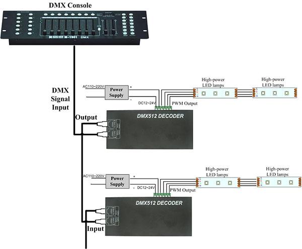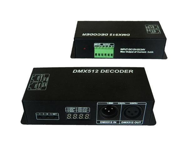 This DMX decoder adopts advanced computer control chip,can receive the international DMX - 512 standard digital control signals and converted into PWM controller signal to drive the LED.It can be controlled by the DMX Console,and can connected with numbers of DMX Decoder to increase the output power to realize all kinds of changing mode.Besides, this DMX decoder can be used as the synchronous controller to controlled the LED alone,it can realize the synchronous effects.This decoder adopt the digital tube to show the address code,and with 3 buttons to setting,make it more easy to used.