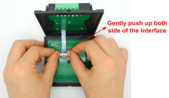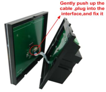 (4) use your hand gently push up the cable seat lock according to step 2, plug the cable into cable seat, press the lock, and mount the cable of panel on the base, as shown below: