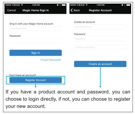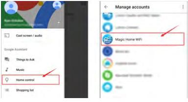 Click Home control on Home APP. Select Magic Home WiFi" The account andpassword must be same as the one you created in Magic HomeProAPP.