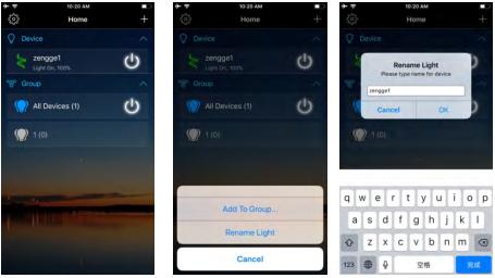 Make sure there is at least one smart lightin device list, and enable your lights for remotecontrol. On "Home" page,long press lighttorename.