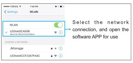 1.Single connection: do not need to register account, open cell phone WIFI network, find“LED net…”signal and connect.