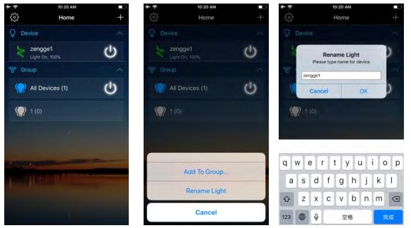 Make sure there is at least one smart lightin device list, and enable your lights for remotecontrol. On "Home" page,long press lighttorename.