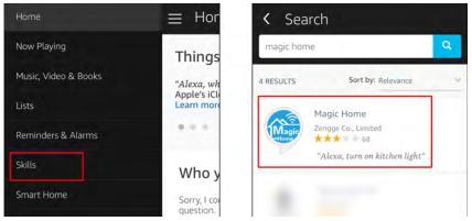 The next step is to download the Amazon Alexa app , open the Amazon Alexa app andunder the skills section, search for the Magic Home skill. The account and passwordmust be same as you created in Magic Home Pro APP.
