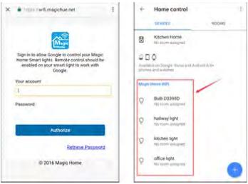Enter your app account and password to finish the account linking. (Use the Magic Homecloud account you used on step 1). Your lights will belisted on Home Control interface.