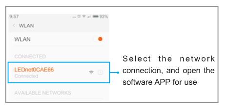 1.Single connection: do not need to register account, open cell phone WIFI network, find“LED net…”signal and connect.