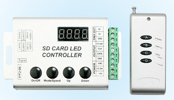 SD card aluminum shell magical color controller is suitable for UCS1903, UCS6803 (TM1804,TM1809, TM2801 etc.) output applications to drive LED directly , and can be widely applied to the light box advertising, stage sets, home decoration; It has many advantages such as low price, easy connection and simplicity to use; It has a memory function; You can select mode, adjust brightness and various dynamic changes in lighting effects through the radio frequency remoter. In addition, we can compile kinds of customer requested change effect to the SD card by software, to realize user-defined dynamic change mode. At the same time it can synchronously control more controllers, continuously expand the output channels, in order to achieve more dimming or various program synchronization change effect.