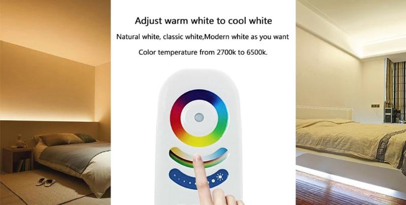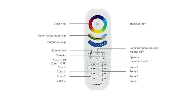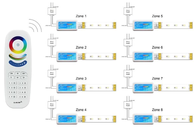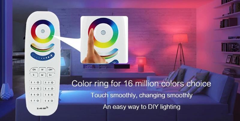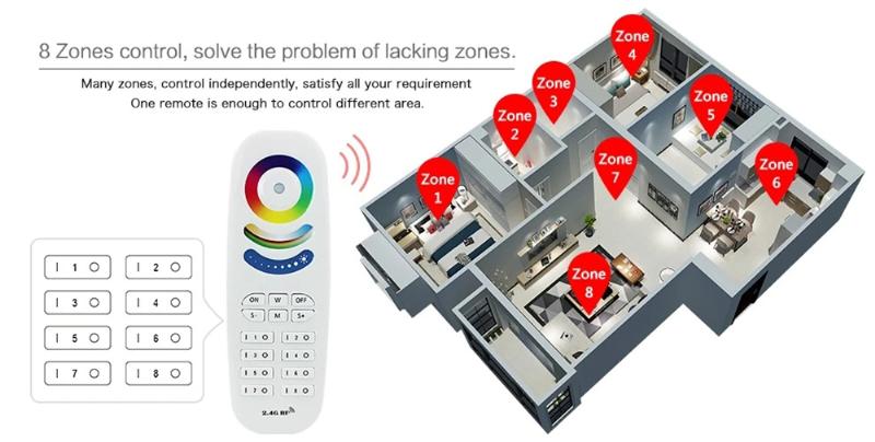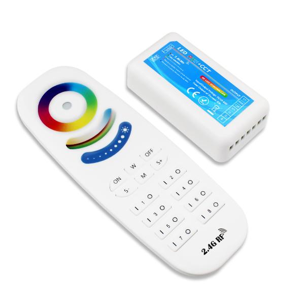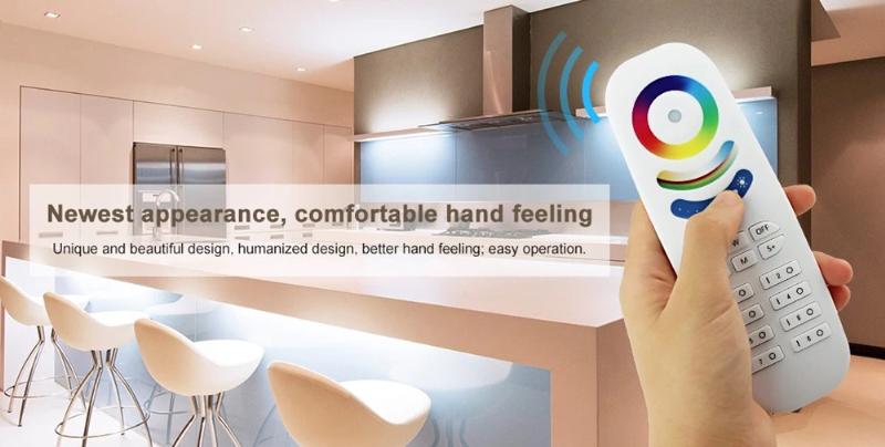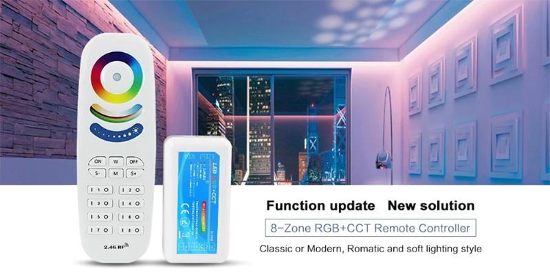 The 2.4G 8 zone RGB+CCT remote control is a universal body touch controller, which adopts the most advanced PWM (Pulse Width Modulation) control technology; it can control all kinds of DC12V-24V LED lighting products, for example: LED module, LED strips, LED light box, LED light source, etc. It is easy to connect and simple to use, with synchronous indicating light and power off memory function etc. Users can choose different kinds of dynamic and color models, adjust brightness, color temperature, speed, etc. Models include flash effect, strobe effect, fade effect and so on.