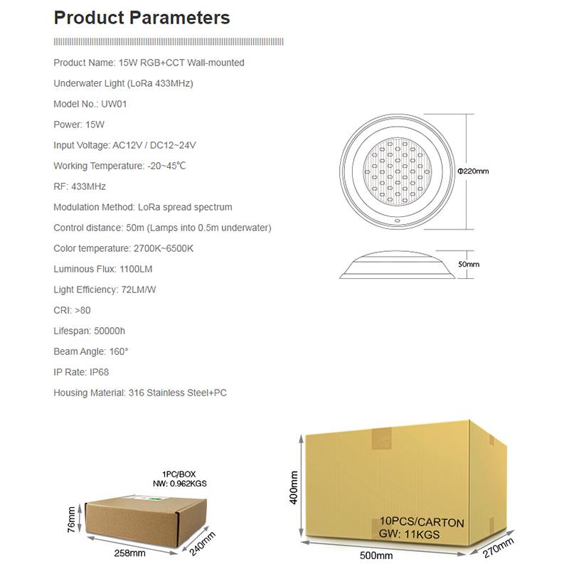 Product Name: 15W RGB+CCT Wall-mounted Underwater Light (LoRa 433MHz)
